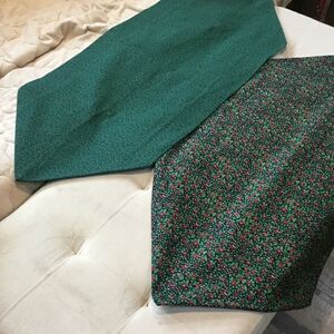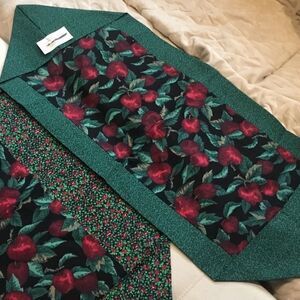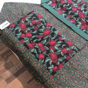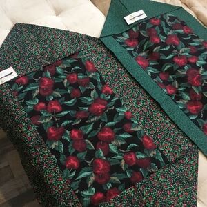 Brand new. Hand crafted from all new 100% cotton fabrics in a smoke free home. This is a set of two runners - for tables or dressers, etc. featuring a dark burgundy apple print surrounded by a small green vine and a red and green mini floral print. They measure approx. 13 1/3” x 34” and 17 1/2” x 33 and come with care instructions.