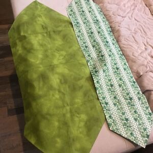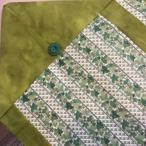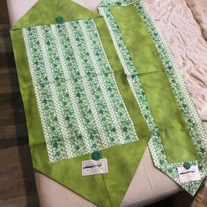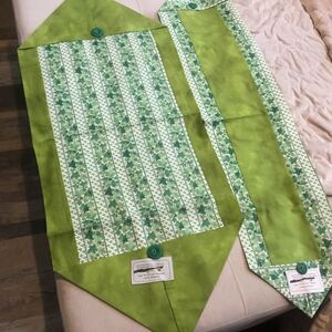 Brand new. Hand crafted with all new 100% cotton fabrics in a smoke free home. This is a set of two runners which can be used on the table, dresser, or wherever you choose.One features a solid grass green center framed in an ivy print accented with green buttons; this measures 8” x 35”. The second runner is the reverse, featuring the ivy print as the center fabric and framed in the solid grass green, also accented with a button. It measures 14 1/4” x 34”. they come with care instructions.