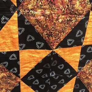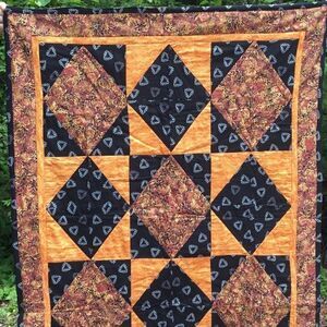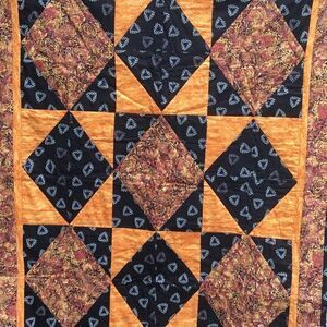 Brand new, hand crafted with all new 100% cotton fabrics in a smoke free home. This beautiful quilt features fall tones of cinnamon and golden chrysanthemums in a floral print, a white and green print on black print and a golden yellow print. It measures approx. 53 1/2” x 43” and has diamond quilting. If you love fall colors, this is the one. Reverses to a coordinating floral print. Comes with care instructions.