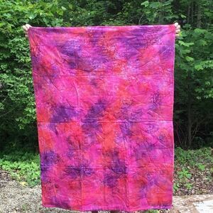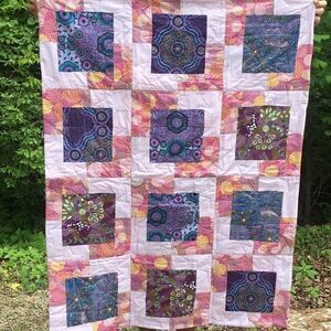 Brand new, hand crafted with 100% all new cotton fabrics in a smoke free home. this quilt is part of the Australian Aboriginal prints collection based on fabrics I purchased on a trip to Australia. Features lavenders, purples and pinks. Please zoom in to see the details in these prints. Star quilting pattern. This quilt measures approx. 39” x 52”. It reverses to a beautiful coordinating fuschia pink and purple batik print (which didn’t come from Australia.). Care instructions are included
