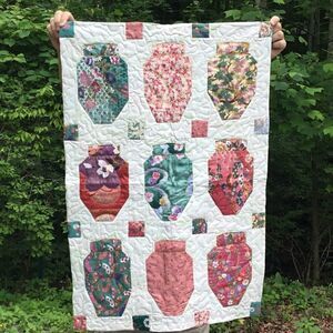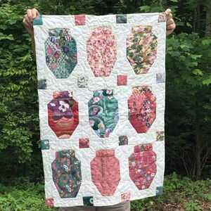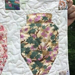 Brand New. Handcrafted from all new 100% cotton fabrics in a smoke free home. This beautiful wall hanging features nine ginger jars against a cream with a touch of light green background. Jars adorned with golden thread stitching which you can see better if you zoom in on the fabrics. Please use 3M Brand Command Strips to hand this without damage to your wall of the quilt. Meander quilting on rest of quilt. Reverses to beautiful oriental fans fabric. Could also be used as a bed runner.