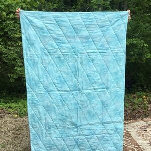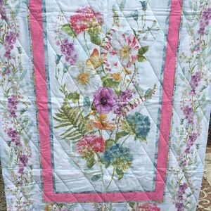 Brand new, hand crafted from all new 100% cotton fabrics in a smoke free home. Gorgeous, dreamy florals attracting butterflies and dragon flies! Very soft colors; 4 borders including wide floral in purples and blues. Features blue thread in the diamond quilting and a sky blue marble backing. It measures approx. 40 3/4” wide by 62 1/2” length. Care instructions are included. Just a calming, dreaming presence.