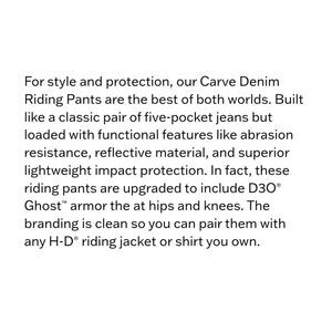 • For style and protection, our Carve Denim Riding Pants are the best of both worlds. Built like a classic pair of five-pocket jeans but loaded with functional features like abrasion resistance, reflective material, and superior lightweight impact protection. In fact, these riding pants are upgraded to include D3O® Ghost™ armor at the hips and knees. The branding is clean so you can pair them with any H-D® riding jacket or shirt you own.