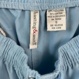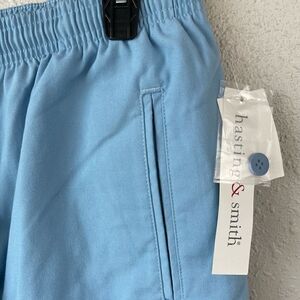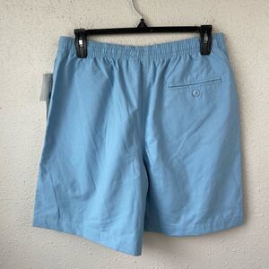 Classic pair of powder blue shirt measuring 14 inches at the stretch fit waist laying flat, 18 inches in length and with a 8 inch inseam.