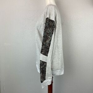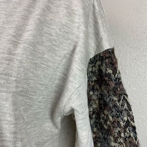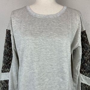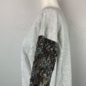 Super unique sweatshirt, featuring a wool blend sweater style down each sleeve. It measures 21 inches armpit armpit laying flat and is 25 inches in length from the shoulder to the hem.