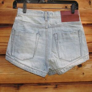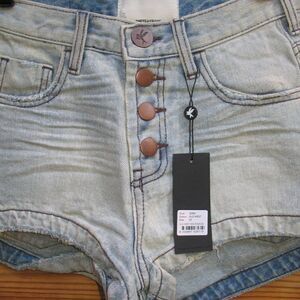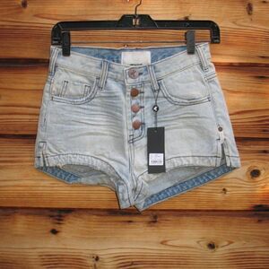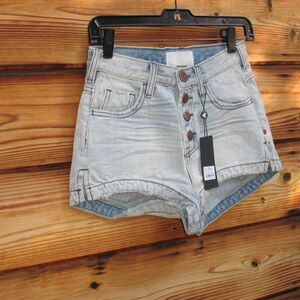 Breezy denim shorts with exposed button fly and raw hem for a cool, well-worn finish.