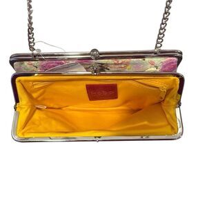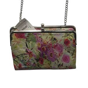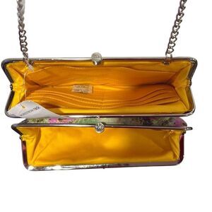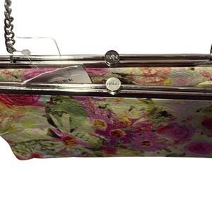 Description: crossbody chain bag with padded portion on strap. Interior pocket on bag holds chain for clutch style bag. Bag has multiple pouches, pockets and credit card slots. Closures are zipper, toggle and magnetic
