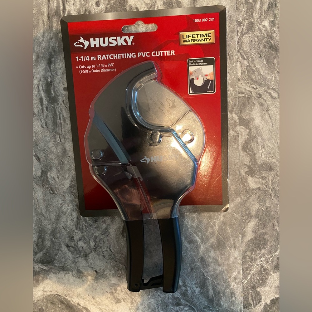Husky 1-1/4 inch ratcheting PVC cutter. Designed for precise and easy cutting.