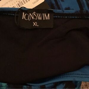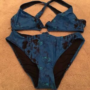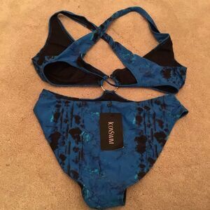 Stylish blue and black bikini set with a unique design. Perfect for the beach or pool.
