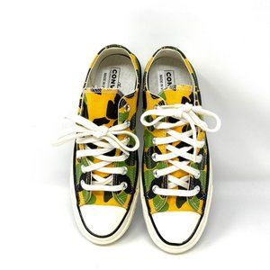 Stylish Converse sneakers with a vibrant yellow and green camouflage pattern. Features classic white laces and sole.