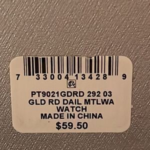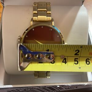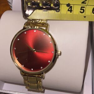 NWT INC International Concepts gold red dial watch. Box has some glue residue from the inventory sticker. Batteries included. Need to take off the side stopper for watch to function.