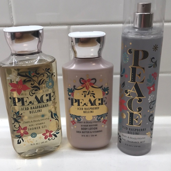 NWT! HTF! RARE! Indulge in the refreshing scent of Iced Raspberry Bellini with this Bath & Body Works set. Featuring a 10fl.oz shower gel, 8oz. body lotion, and 8oz. fragrance mist, each product is designed to leave your skin feeling soft and fragrant. Part of the Christmas limited edition sets!