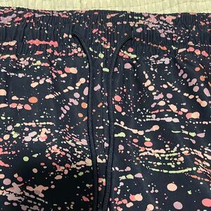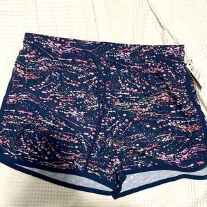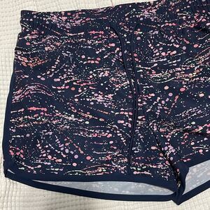 Navy blue with splattered like pattern, drawstring waistband, lined, dolphin like side hem, active short, approx 3.75”