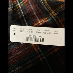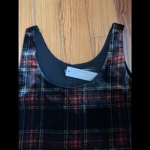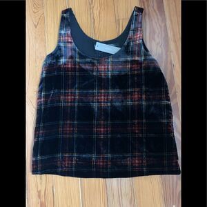 New with tags. Dark tartan plaid velvet top. Button closure on back. Size 00