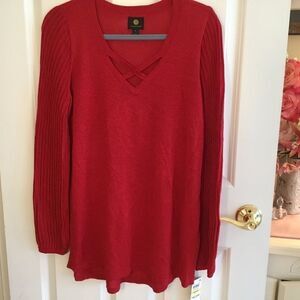 Brand new with tags. JM Collection Red Lurex Long Sleeve Blouse with Lattice Neckline and ribbed sleeves Very pretty - not overly metallic, just right! Size is Medium. Longer, tunic style; back neckline to hemline is 30 1/2”Showing photos of front and back sides along with fiber content tag.