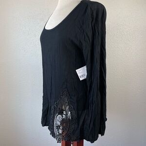 Super cute blouse style top featuring a lace design at the waist. It measures 18 inches armpit to armpit laying flat and 25 inches in length from shoulder to hem.