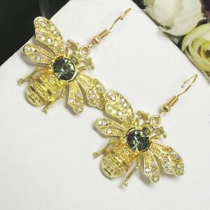 These beautiful dangle fishhook golden jeweled bee earrings pay homage to the creatures that put food on our tables, spread flowers and fruits and whom we could not live without. For each pair I sell I plant a flower in my organic garden to remind me of how critical it is to give them what they need so that they continue to give. Jeweled with rhinestones and a center green stone. Just beautiful. To the bees!