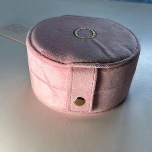 This pink Jewelry Box offers a stylish and practical solution for storing your jewelry essentials. The compact circular shape is complemented by a metallic gold ring detail on the front, adding a touch of elegance. This is perfect for both travel and everyday use.