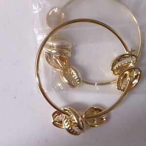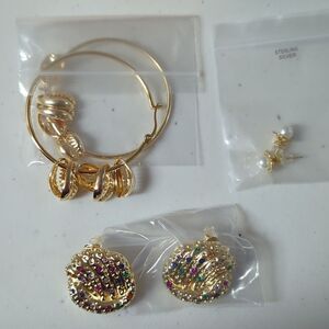 Pink Travel Jewelry Case with spots for rings. necklaces and earrings. Gold hoop earrings with shells, Gold Pearl studs, gold and jewel studs.