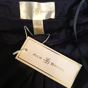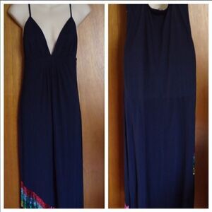Gorgeous maxi dress by Julie Brown. Dark navy color. Halter style top with full length bottom. Rainbow sequins accent the bottom front of dress. Straps are not adjustable. Size Large. Unlined. Polyester, rayon, spandex. Subtle pleating at front. Straps criss cross in the back. Hidden side zip. 15” across armpit to armpit, unstretched. Underarm to floor measures 49” long. New with tags. Size Large. P2500