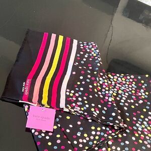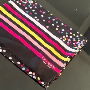 Festive confetti dots and colorful stripes pattern this contemporary woven scarf that's sure to delight.