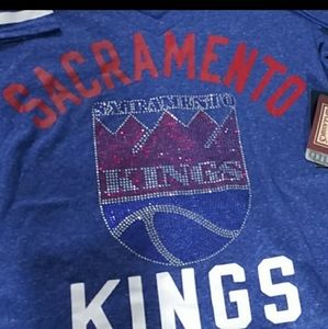 Officially licensed NBA hardwood classic Apparel • 60% cotton/40% poly slub jersey • Scoop neck, Raglan sleeves with curved hem styling • Heather grey body with primary team color sleeves • Team name in iridescent sequins and team logo screen-printed at front chest