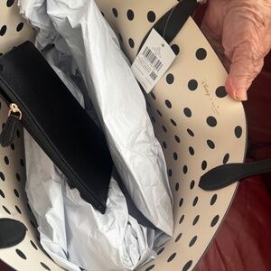 This beautiful Minnie Mouse Kate Spade is REVERSABLE....The other side is so cute, it is white with little black polka dots! On the inside of this tote is a very nice zip bag for special items.