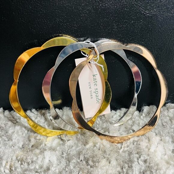 Keep it cute and chic wearing this Kate Spade Slender Scallops Bangle Set. Multi-plated metal in rose gold, silver and gold. Diameter 2.5” x 2.5”. *Brand new with tags. Authentic brand
