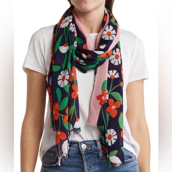 Beautiful and bright daisies decorate this lightweight oblong scarf for a pop of color to elevate your look.