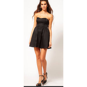 The details include: a sweetheart neckline with a boned bodice, a side zip fastening, a high waist and a flared skirt with a pleated overlay and a short-cut length.