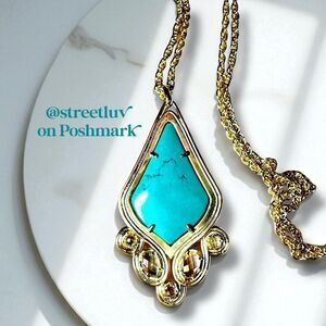 Kendra Scott Teresa pendant necklace in vintage gold with iridescent teal magnesite stone, new with tags, in dust bag and yellow box.