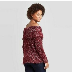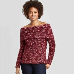 This long-sleeve women's sweater comes in red for a pop of color, and the eyelash construction adds a soft, textured look for even more interest. Plus, the off-shoulder cut lends flirty finish, while lightweight fabric provides all-day comfort.