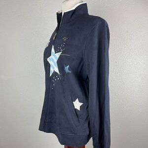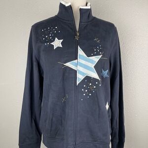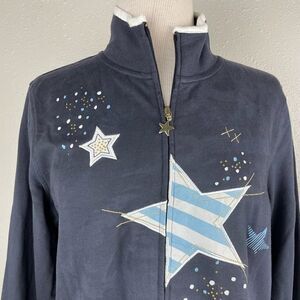 Super fun light weight full zip jacket by Koret featuring a “chilly starry night” design. It measures 21 inches armpit to armpit laying flat and 24 inches in length from shoulder to hem.