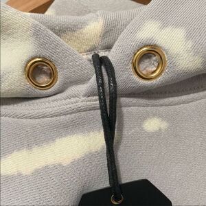Long sleeve cotton fleece hoodie featuring tie-dye pattern in tones of yellow and grey throughout. Kangaroo pocket at waist. Rib knit cuffs and hem. Gold-tone hardware.