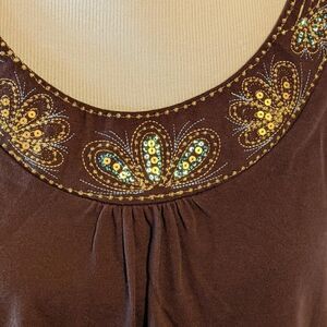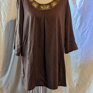 NEW WITH TAGS LIZ & CO BROWN 3/4 SLEEVE TUNIC TOP BEAUTIFULLY BEADED NECKLINE 14/16W