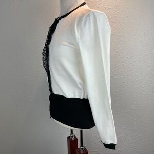 Beautiful light cardigan top by Larry Levine featuring a black lace button up design. It measures 18 inches armpit to armpit and 21 inches in length.