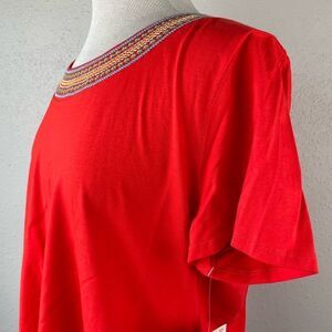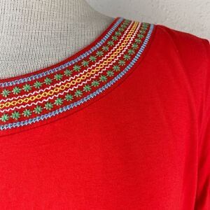 Love the color and embroidered design at the collar on this top. It measures 21 inches armpit to armpit laying flat and 26 inches in length from shoulder to hem.