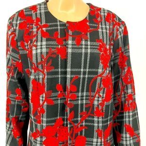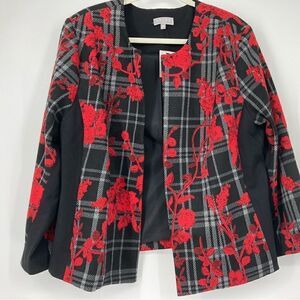 NWT Laura Plus Black/Red Floral Jacket Size 18 Made in Canada Shoulder 18”/Pit 25”/Sleeve 23,5”/Shoulder to Hem 25” Black elastic inserts on the Sleeves and sides create a slimming effect Open Front