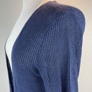 Beautiful navy blue linen cardigan sweater top by Lauren Ralph Lauren measuring 20 inches armpit to armpit and 28 inches in length.