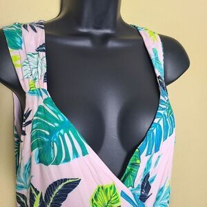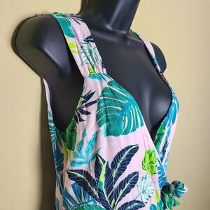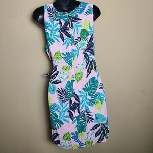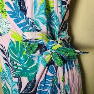 This is a new with tags dress by Le Lis. It is pink with green and blue palm print. This is a wrap style dress that ties around the waist. There is a zipper on the back with a hidden inner clasp.