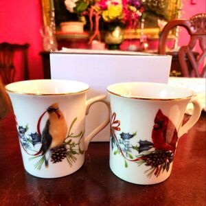 Set Of Two Lenox "Winter Birds" 12 oz. Porcelain Mugs w/24K Gold Trim