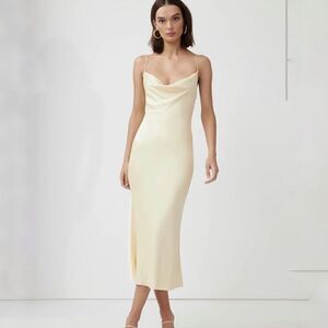 This dress is absolutely stunning! It’s high quality stretchy polysatine that fits so well, and is so flattering! Size 6, fits like a loose size 6. Super high quality, this would be your best satin dress ever. Retails for $198 plus tax.