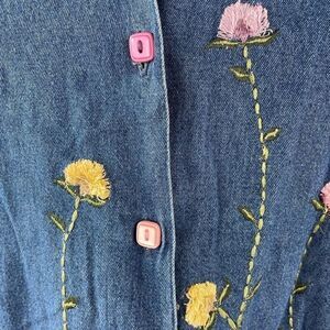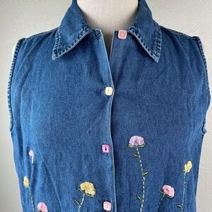 Super fun denim style button down shirt by Life Style featuring a danty floral design and super cute buttons. It measures 20 inches armpit to armpit and 24 inches in length.