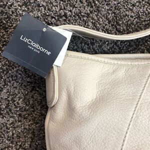 Cute and classic bone white leather hobo by Liz Claiborne. It measures 13 inches in length, 7 inches in height and is 3 inches in depth at the base. The drop on the handle is 5 inches. It’s in new condition with tags.
