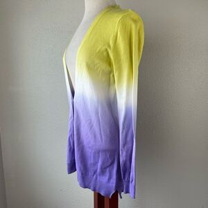 Love the colors and design on this cardigan sweater measuring 20 inches armpit to armpit laying flat and 30 inches in length from shoulder to hem.