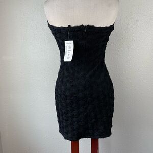 Super cute and flattering strapless black midi dress by Love Cukture featuring a lace flower design. It measures 16 inches armpit to armpit and 28 inches in length.