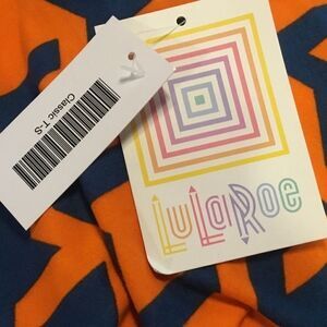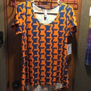 Brand new with tags. LuLaRoe brand women’s super soft (you want to keep petting it!) short sleeve tee shirt in women’s size Small. Royal blue and orange geometric print, round neck. Asymmetrical hem with extra length in back. Front has straight hem and back has rounded one. Showing photos of front and back sides along with fiber contents info.