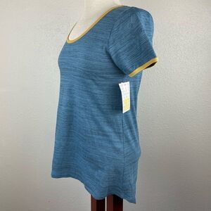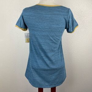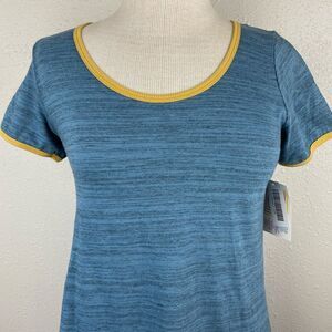 Cute blue t-shirt featuring a yellow trim. It measures 17 inches armpit to armpit laying flat and 24 inches in length from shoulder to hem.
