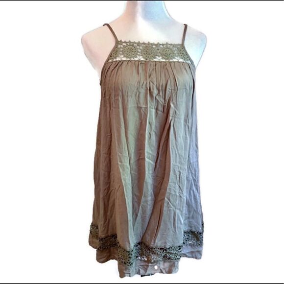 NWT Lulu’s olive green sundress with adjustable straps, fully lined, macrame design at the chest and hemline and overall stretch. Bust 36”, length (from top of bodice) 29” and waist 40”.