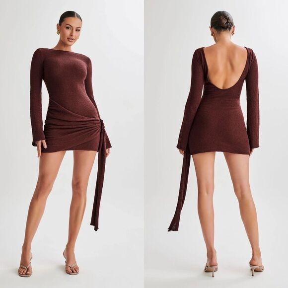 NWT MESHKI Liana Long Sleeve High Neck Open Back Knit Mini Dress in Plum size XL